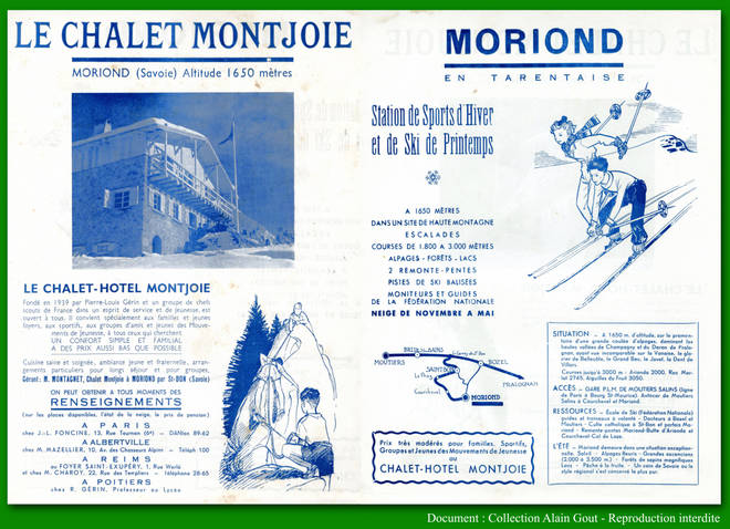 Tract publicitaire pour le chalet-hôtel Montjoie à Moriond (Savoie) avec un skieur et une skieuse.
