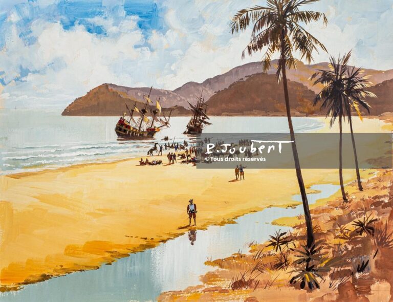 Code PJ : Pierre Joubert OR-NP-LH-MEX-débarquement-1961 Titre : Cortez débarquant sur la plage Technique : Gouache (GOU) Description : Cortez débarquant sur la plage Gouache découverte par la vente “Good” du 11 mai 2021 qui provient de la famille de JC Berrier . Il les utilisait pour sa présentation sur le Mexique par les conférences … Lire la suite de 1961 Cortez débarquant sur la plage – Original