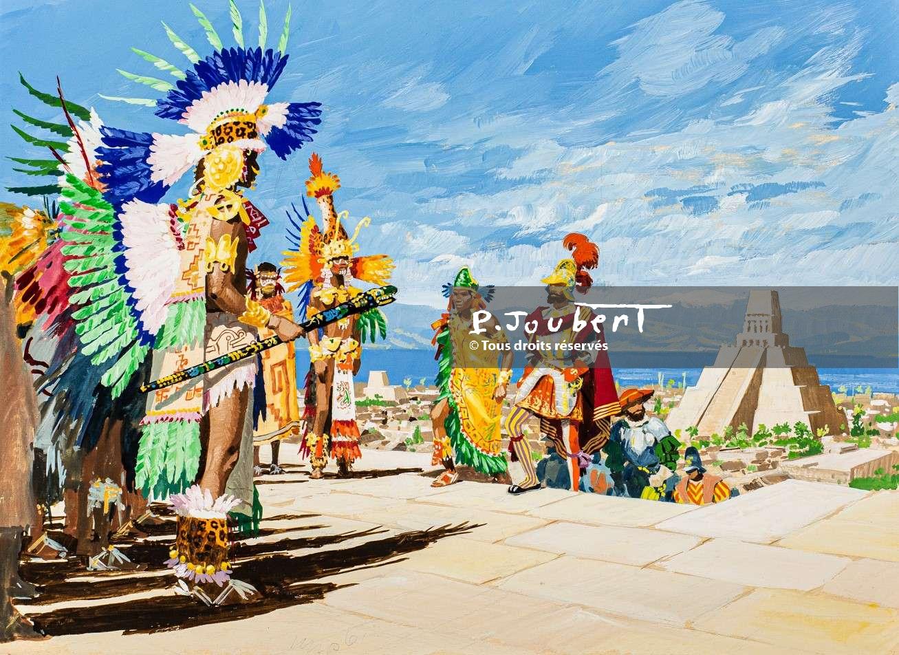 Description : Cortez vient négocier avec le grand chef des Aztèques