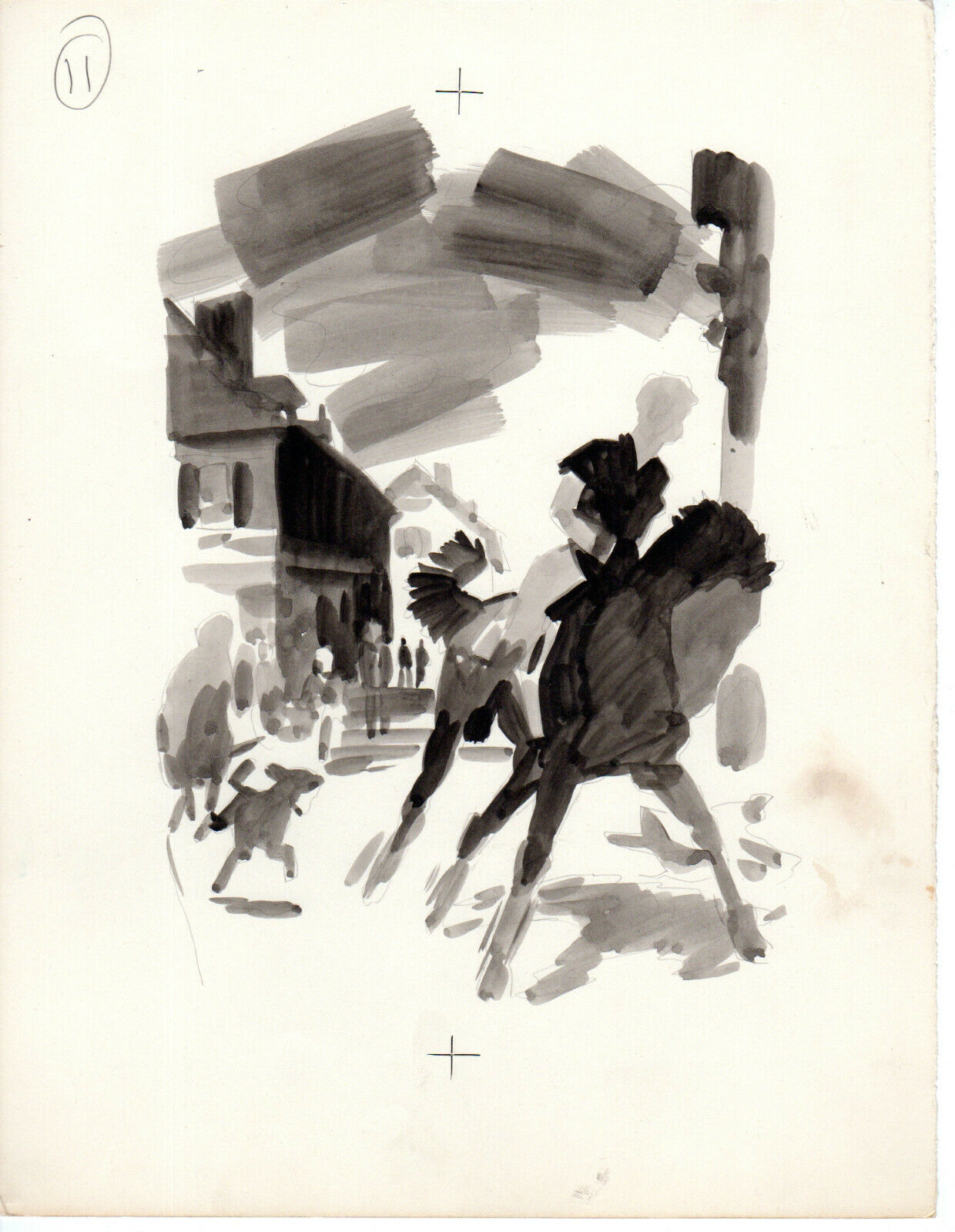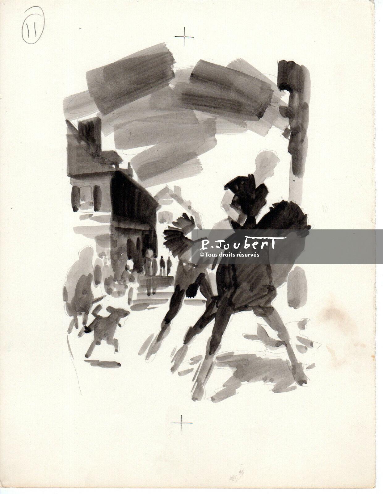 Description : Dessin original de Pierre Joubert, indications de couleurs, pour le roman Signe de Piste : « Forêt Sauvage », dessin de la page 143