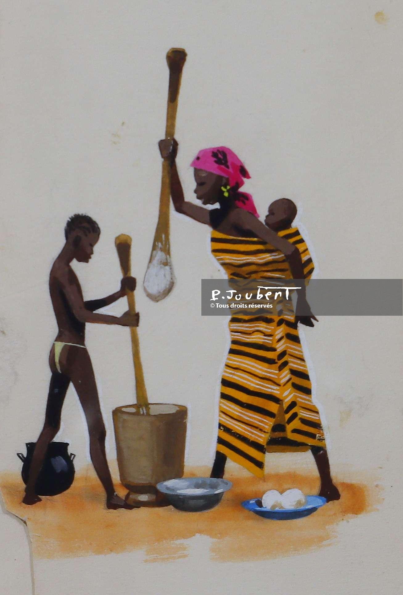 Titre : les ignames cuites sont pilées dans un grand mortier.
