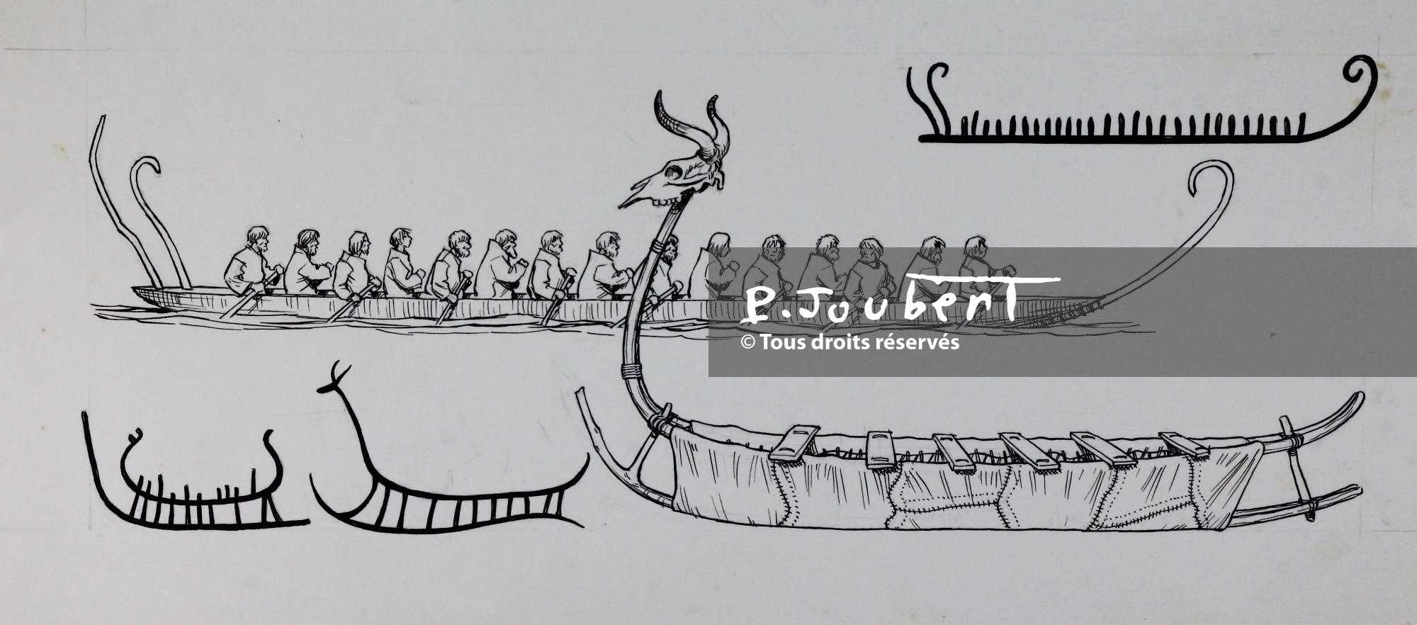 Ces gravures sur rocher datent de l’âge de bronze. Elles parsèment la bande côtière depuis la Scanie, partie méridionale de la Suède, jusqu’à l’extrême Nord de la Scandinavie. Elles représentent des embarcations très divers, de longues pirogues ou des canots à armature, habillés de peaux. Ces gravures très vivantes, permettent des reconstitutions sans doute très proches de la réalité, comme celles représentées ci-dessus.