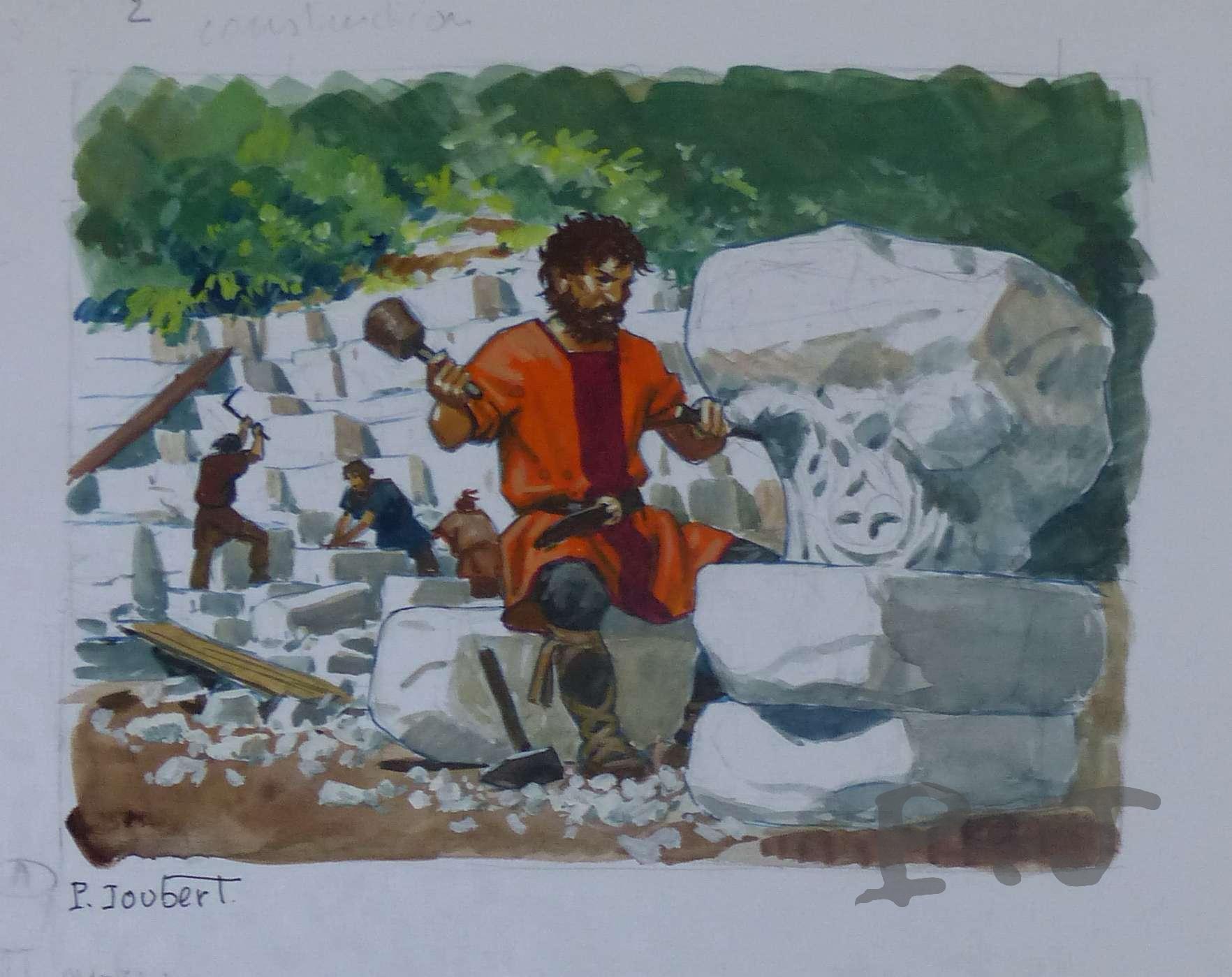Dans les carrières de marbre blanc des Pyrénées, ce tailleur de pierre ébauche la forme et le décor d’un chapiteau de style corinthien. Derrière lui, on aperçoit les carriers au travail. Ils débitent les blocs de marbre par lits successifs, donnant ainsi au front de taille son profil en marches d’escalier.