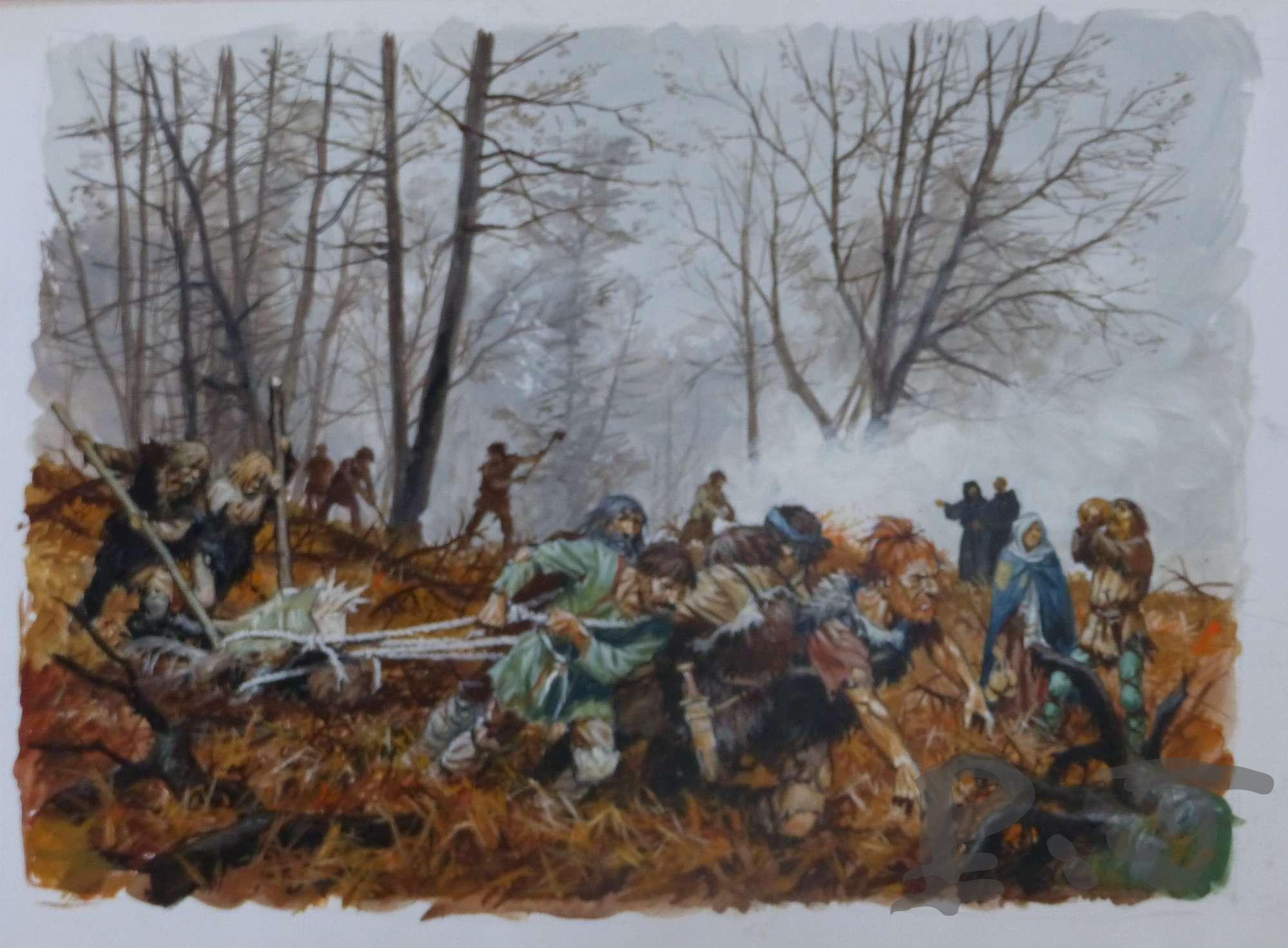 Défricher la foret est un travail pénible mais nécessaire, quand il faut accroitre le nombre des terres cultivables. Les paysans abattent les arbres et s’acharnent à déraciner les souches pour le compte des moines de l’abbaye voisine, propriétaires de ce sous-bois.