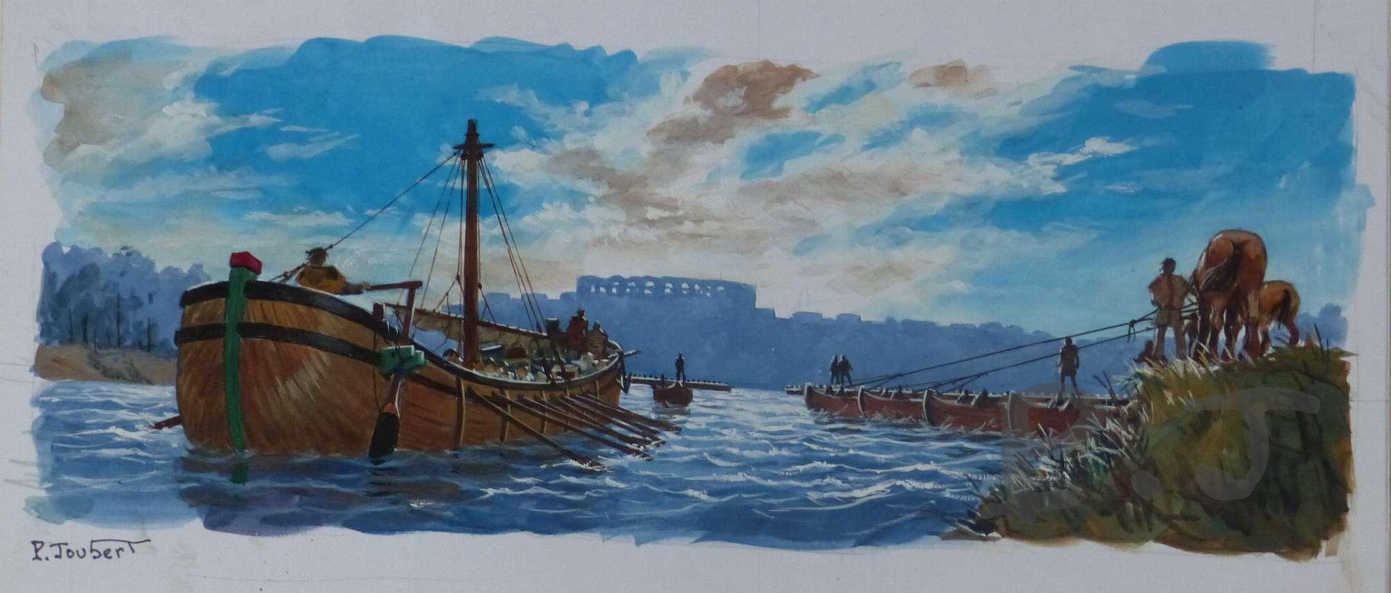 Descendant le Rhône, cette embarcation ventrue (ou linter) est en vue de la ville d’Arles. Pour lui laisser le passage, on a ouvert par son milieu, en profitant du courant, le pont de bateaux qui permet de franchir le fleuve. Aussitôt après, on le referme à l’aide de cordage que les chevaux tirent sur chaque rive, remontant à contre-courant les deux extrémités du pont mobile.