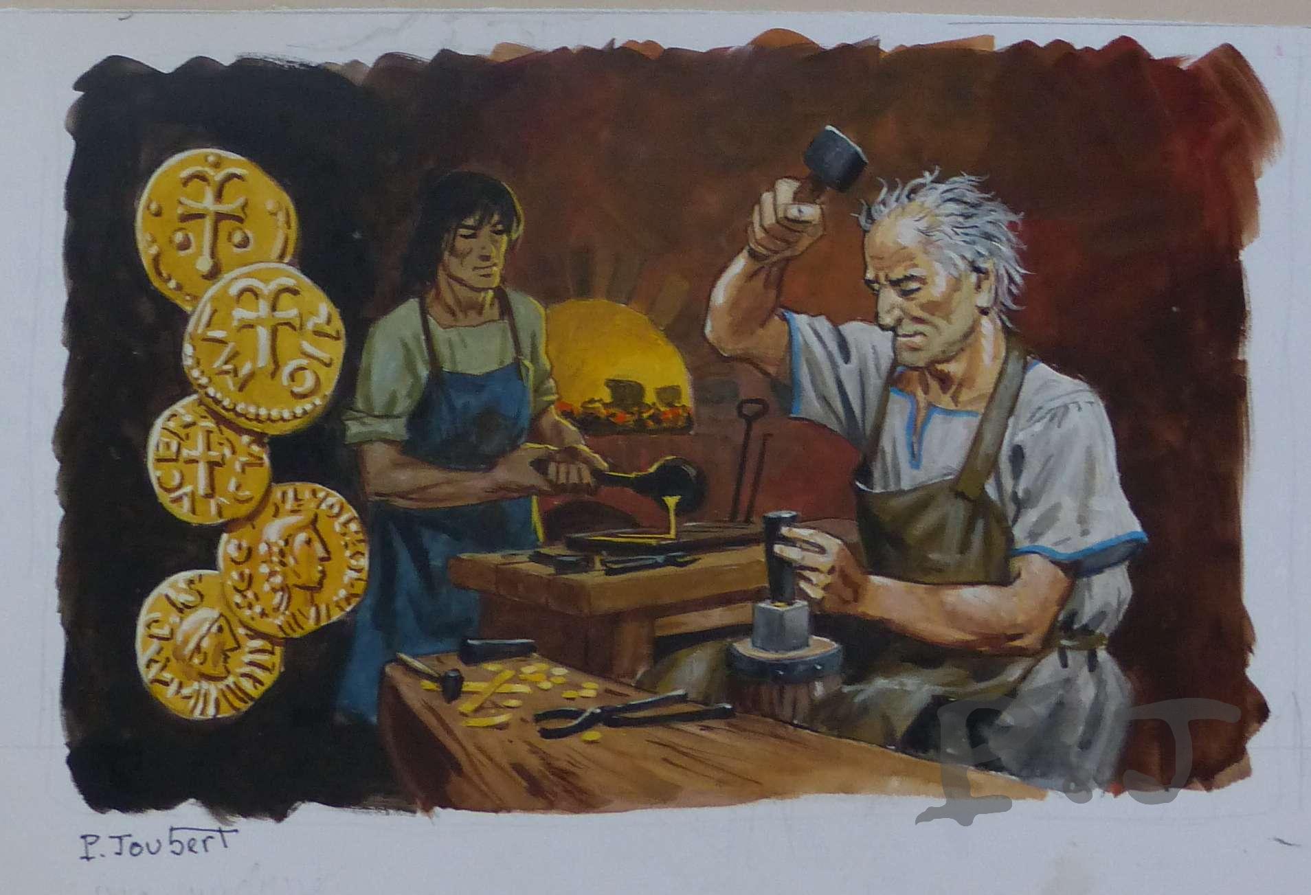 Ayant posé une rondelle d’or ( ou flan ) sur le coin fixe (ou pile ), le monétaire place dessus le coin mobile ( ou trousseau), sur lequel il frappe un grand coup de marteau. Il imprime ainsi en relief sur les faces de la pièce les motifs gravés sur les coins de métal. Son aide moule de petits lingots d’or.