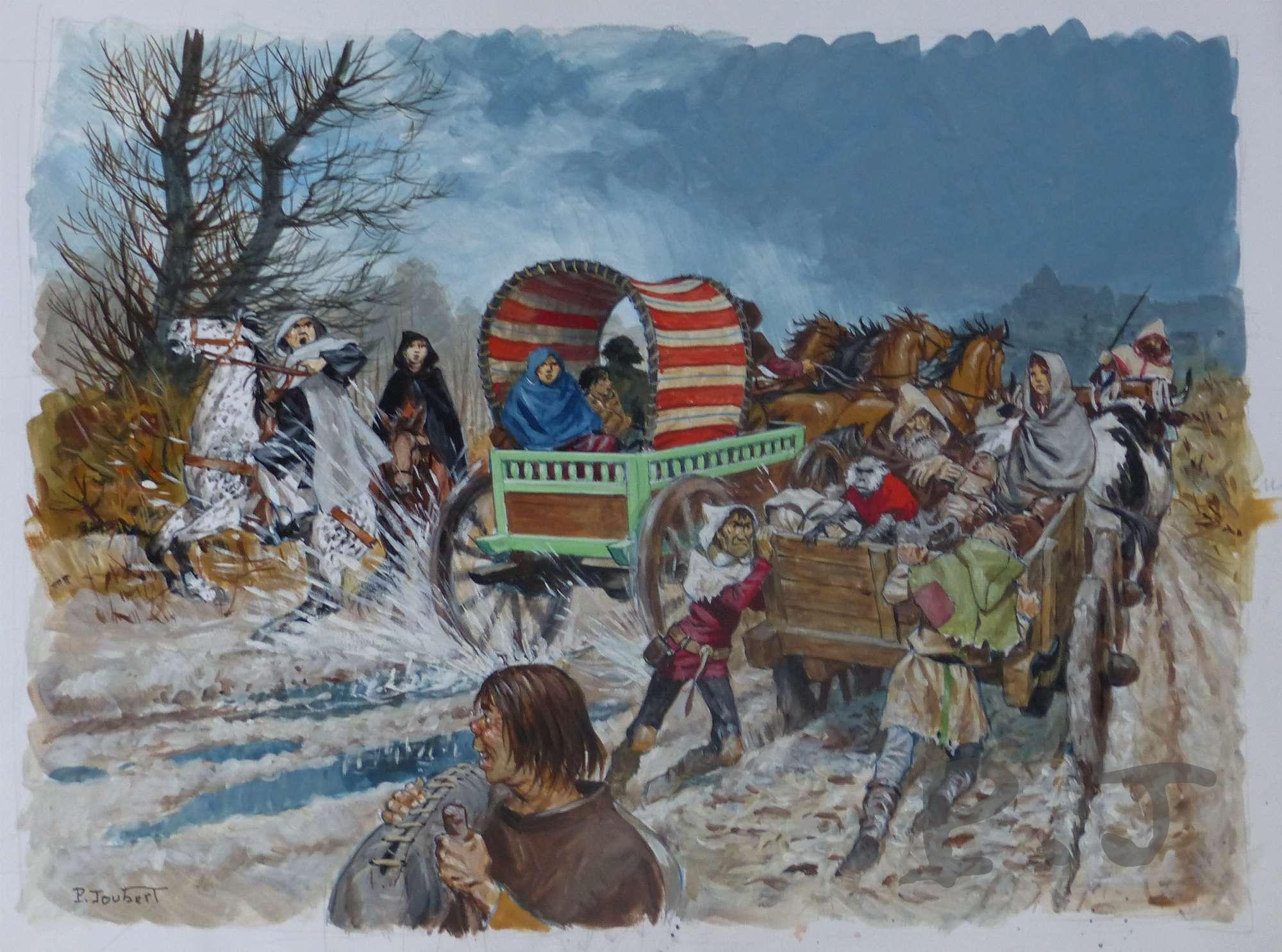 L’ancienne route romaine est mal entretenue et la circulation y est difficile l’hiver. Le lourd char à bœufs (ou carruca) de cette troupe de comédiens s’est embourbé dans de profondes ornières. Il est doublé sans précaution par une voiture légère tirée par quatre chevaux (ou rheda) qui roule à vive allure. Deux clercs à cheval, qui n’ont pu s’écarter à temps, se font éclabousser.