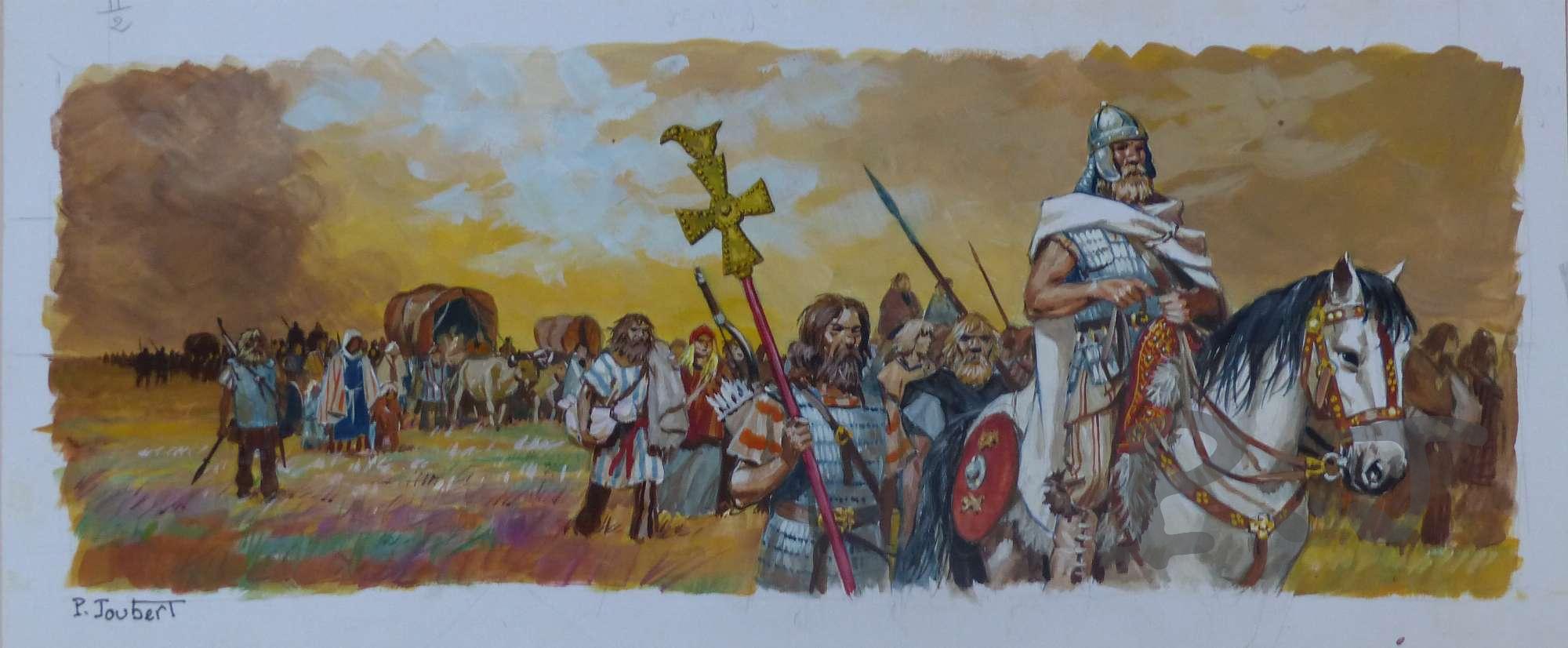 Description : A la page 17 de l’Album ” Au temps des royaumes barbares” se trouve la description du long cortège qui escorte le roi Alboin, roi des lombards. Ils ont choisi de s’installer en Italie dont les terres hospitalières sont mal défendues par l’armée byzantine.