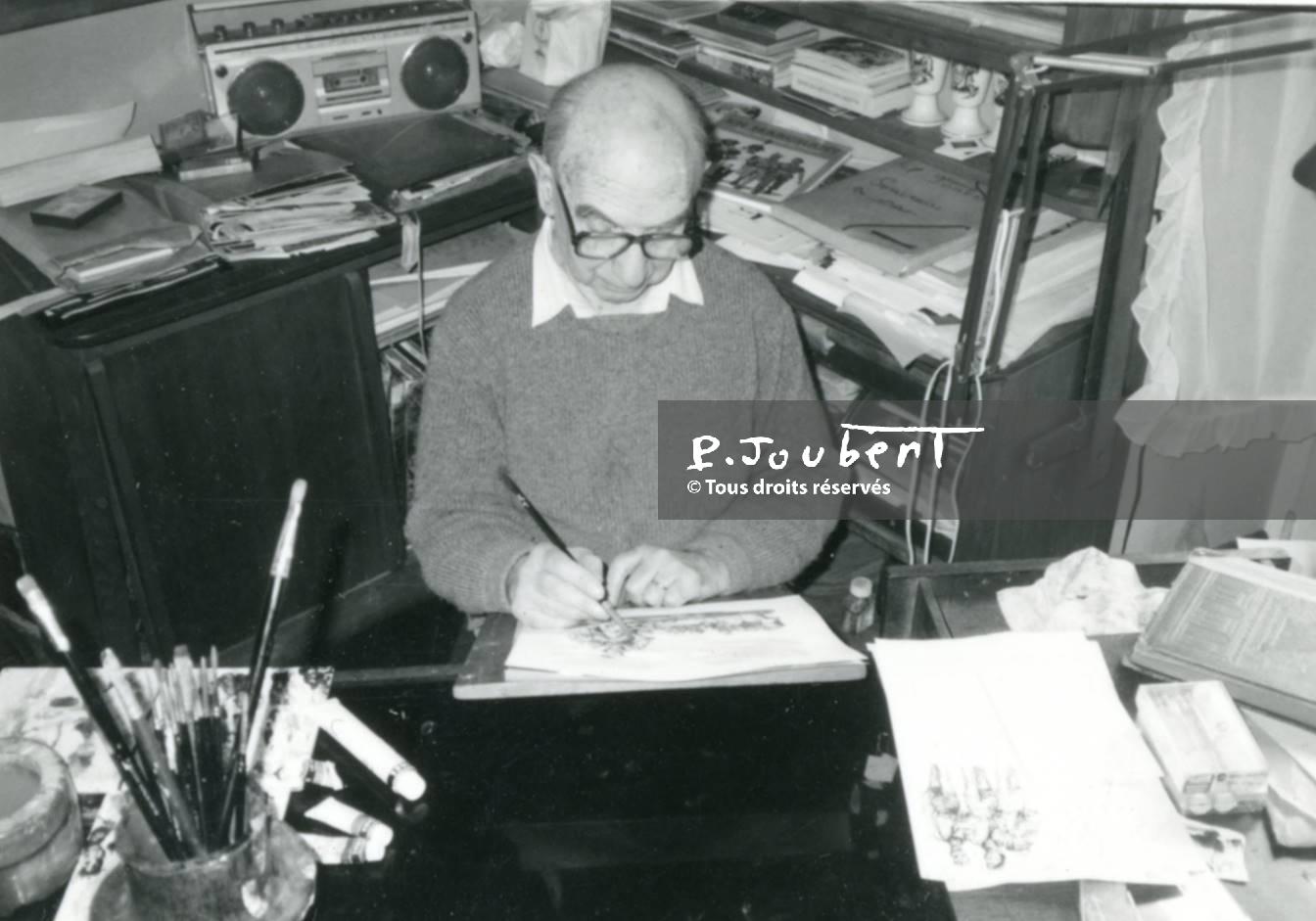 Détail : Pierre Joubert vers 1985 assis à son bureau avec un dessin encre de chine de “En marchant avec les soldats de France” paru en 1985
