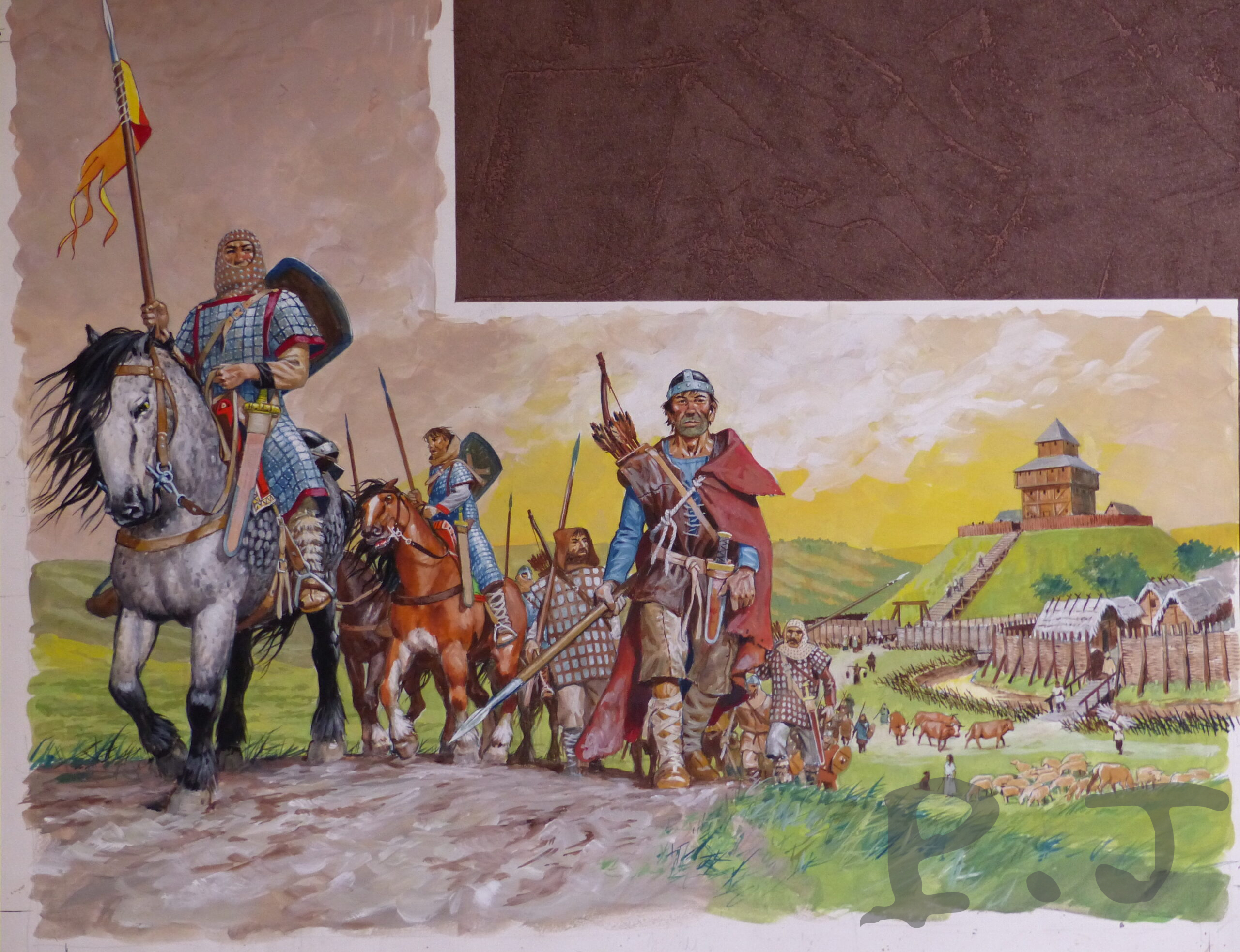 L’armement des guettiers au XI eme siècle. Protégé par une “broigne” de cuir recouverte de plaques de métal, le cavalier porte une lance et une épée, le fantassin un arc et un épieu.