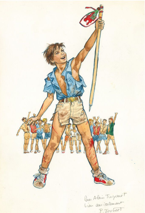 Ce scout brandissant un fanion de patrouille est accompagné d’une frise de personnages en arrière-plan qui est très remarquable car il s’agit d’un motif assez rare chez Joubert, que l’on retrouve cependant à travers le temps à des périodes très différentes. Un portrait d’un souverain français, réalisé en 1940 et inédit, semble la première représentation de ce type. Puis la série de l’adolescence à travers les âges réalisée de 1972 à 1974 reprend l’idée. La manière très particulière de peindre avec une gouache très délayée, surlignée de détails faisant ressortir le sang des blessures, se rapproche elle des dessins des années 1950, comme certains de ceux des Contes du bourreau ou encore la couverture de l’édition de 1953 de la Bande des Ayacks.