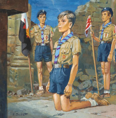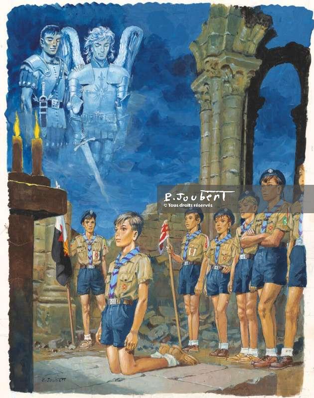 La veillée de promesse est un rite scout ancien, un rite de passage, passage d’une adolescence banale à une chevalerie des temps modernes. Dans cette illustration, Joubert utilise tous les codes propres à l’imagerie scoute et à son lien avec la chevalerie. Tout y est symbolique : dans les ruines d’une église qui rappellent que les chevaliers protégeaient l’Église, le jeune scout à genou reçoit l’adoubement de l’archange Saint Michel, sur lequel s’appuie un soldat romain. Il s’agit de Saint Martin, celui qui donna son manteau à un pauvre. Il est, avec Saint Michel, le saint patron de la France. Jean-François Vivier