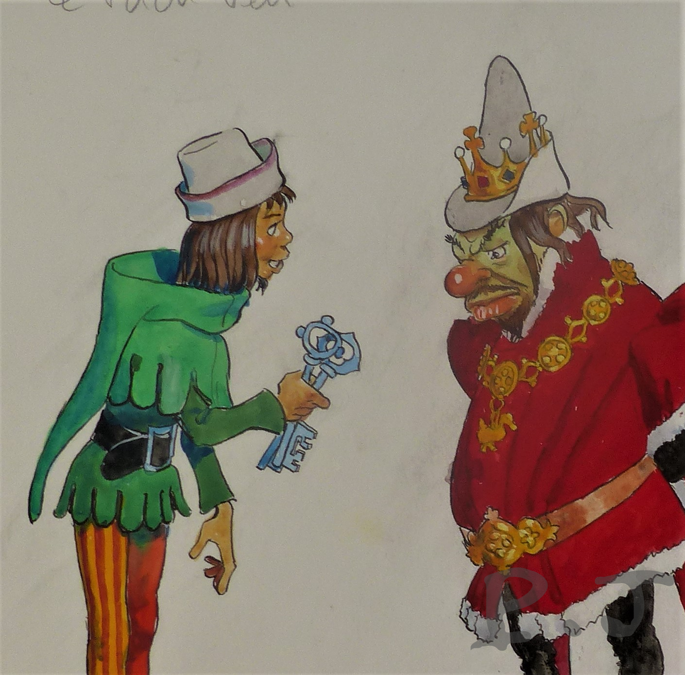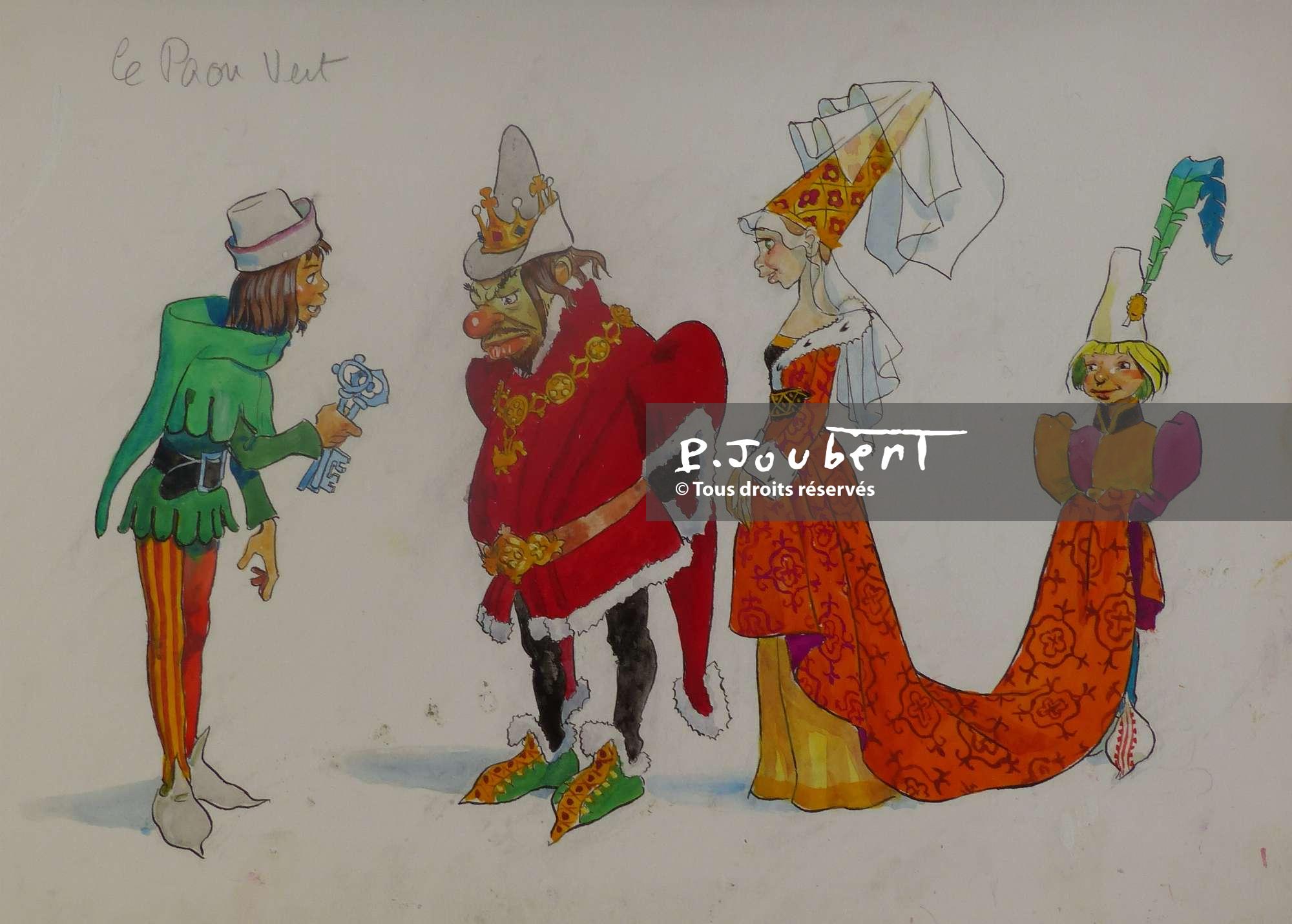 Description : le paon vert : Petit- Jean, plus heureux qu’eux encore, porte les clefs à monsieur le roi.