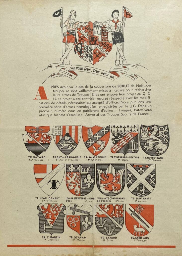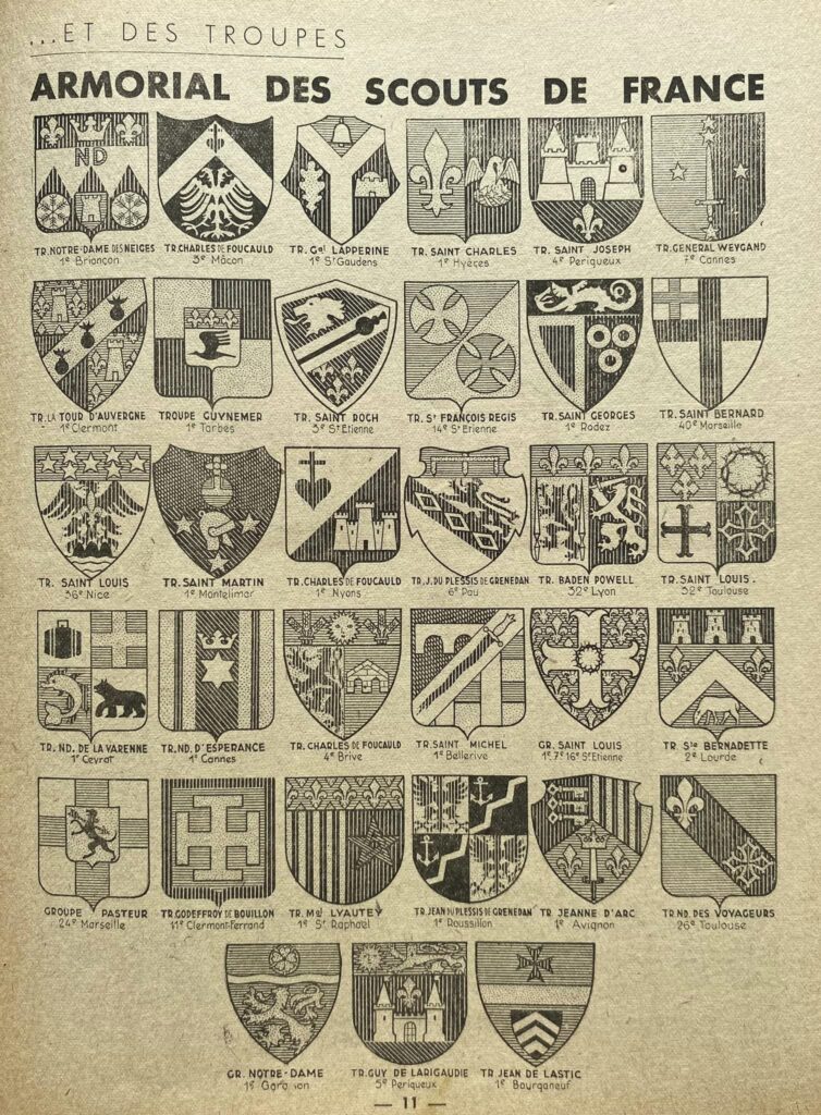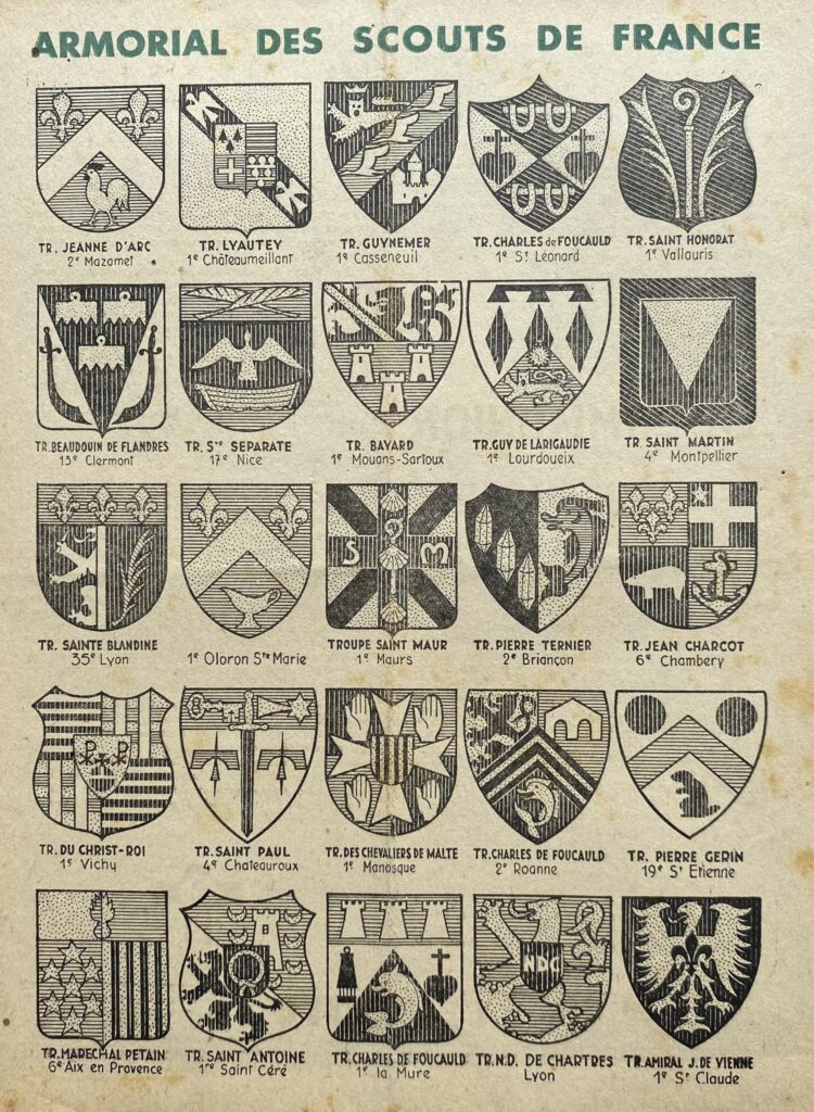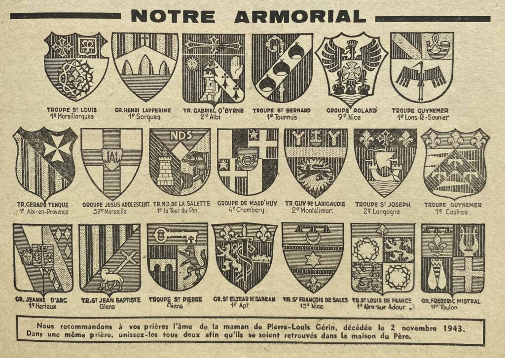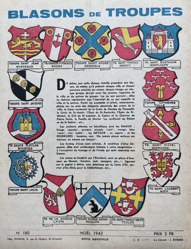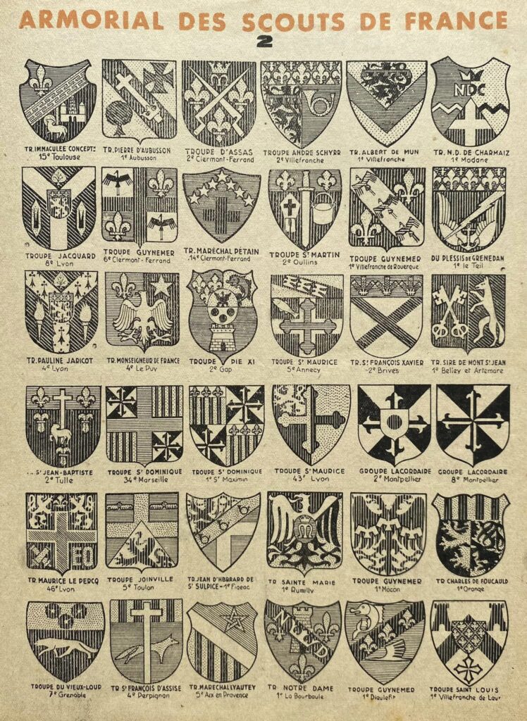 Documents tirés des revues “Scout” des années 1942 à 1944. Il aurait existé un livre Armorial des Scouts de France recensant tous les blasons de Troupes reçus par le QG.