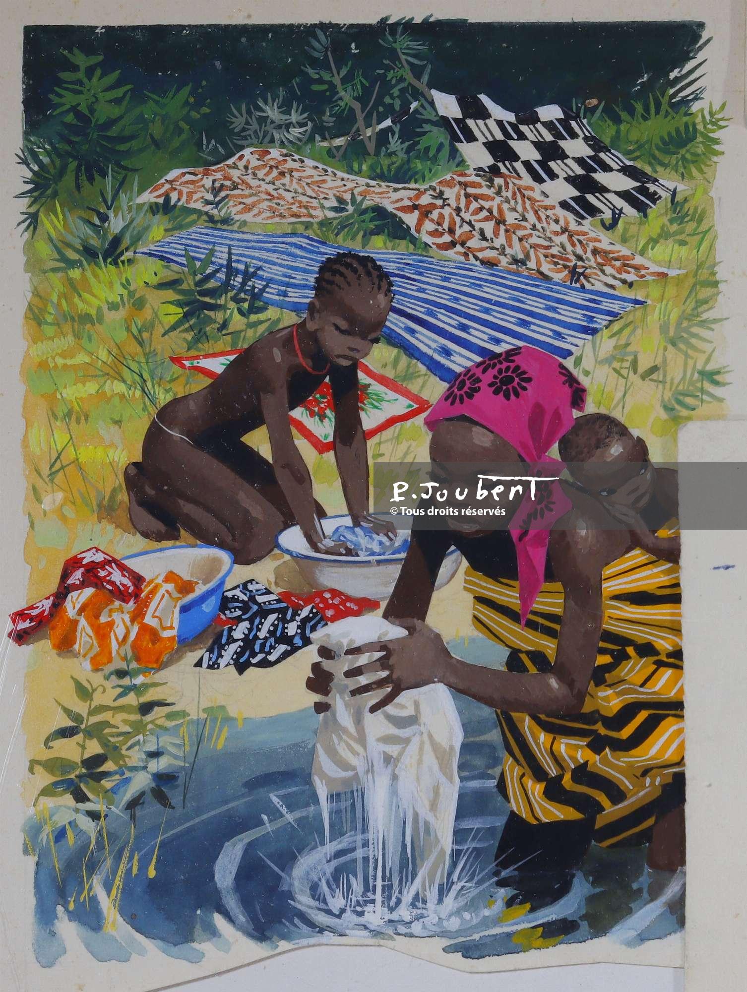 Description : Tiré de la revue “Jeunes années magazine” numéro spécial sur la vie quotidienne de deux enfants africains dans leur village du pays Baoulé, en Côte d’Ivoire. page 16 en haut à gauche