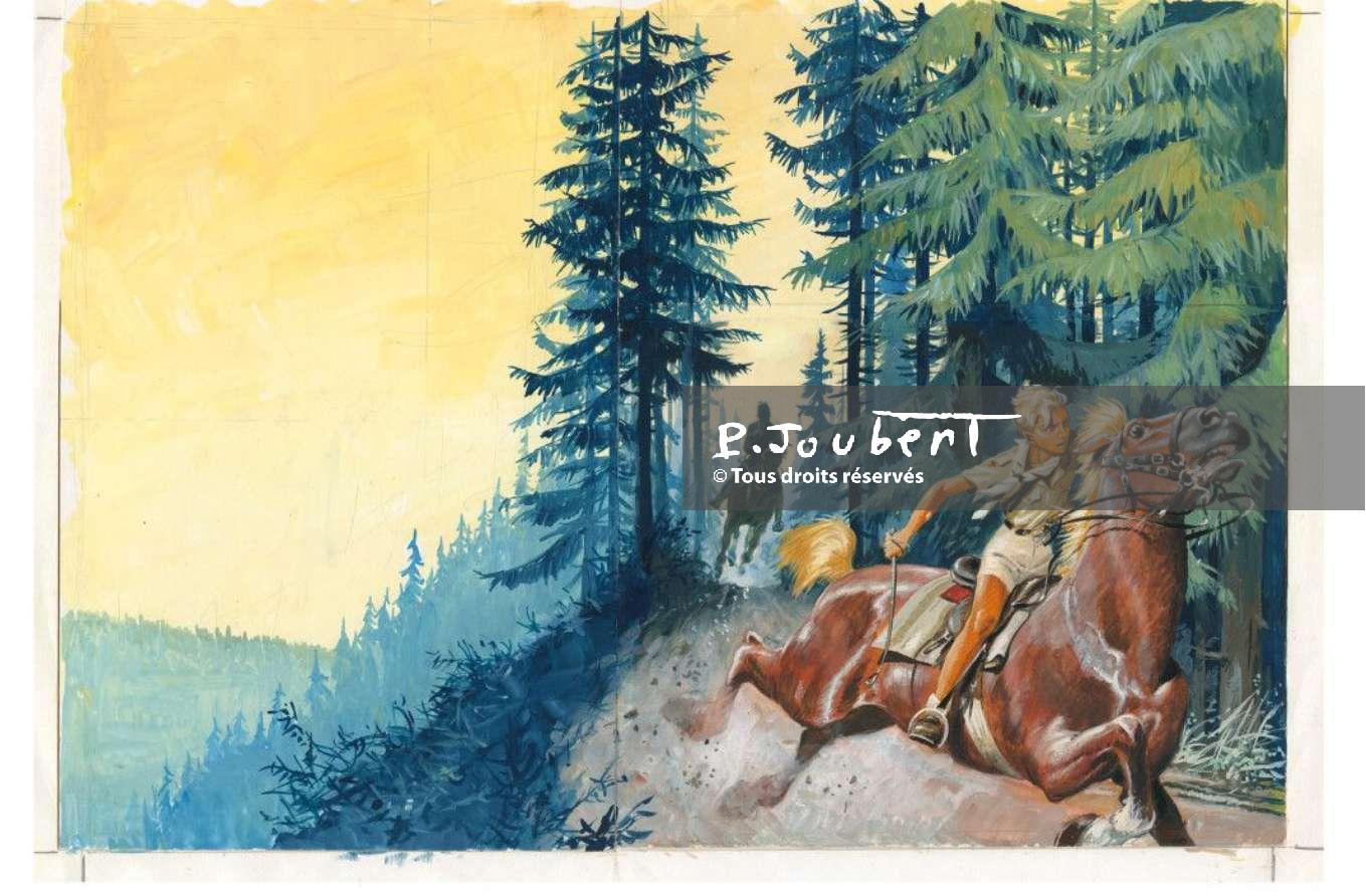 Un mythe ! En effet, Le Bracelet de vermeil est sans doute (avec sa suite, Le Prince Éric) le roman scout par excellence. Retour au milieu des années 30. Pierre Joubert effectue son service militaire au 158e d’infanterie à Strasbourg. Il se lie d’amitié avec le fils de son colonel. Il s’appelle Yves de Verdilhac. Ensemble, ils imaginent une histoire d’amitié, de prince nordique et de serment familial qui traverse les siècles… le tout se déroulant lors d’un camp scout. Pour écrire le roman, Yves prend un nom de plume. Désormais, il sera Serge Dalens. Le roman sort en 1937 dans la toute nouvelle collection Signe de piste lancée par les éditions Alsatia. Il est le deuxième titre de la collection et en sera l’un des fers de lance. L’ensemble de la série des Prince Éric se vendra à plus de trois millions d’exemplaires en faisant un classique de la littérature jeunesse. Bien entendu, Pierre Joubert en sera l’illustrateur. Il donne naissance à ce jeune prince blond qui fera rêver des générations de lecteurs. Pour ce titre, il va concevoir pas moins de sept couvertures sur 50 ans, de 1937 à 1989. Le dessin présenté ici est en partie réalisé au début des années 50 pour la première réédition du titre. C’est la partie droite du dessin. La partie gauche, quant à elle, est dessinée à la fin des années 80 pour une nouvelle édition en jaquette complète. Quelle puissance dans ce dessin ! Le mouvement est parfaitement rendu, la panique du cheval est explicite et la détermination d’Éric évidente. Joubert manie la gouache avec une dextérité que bien peu atteignent.