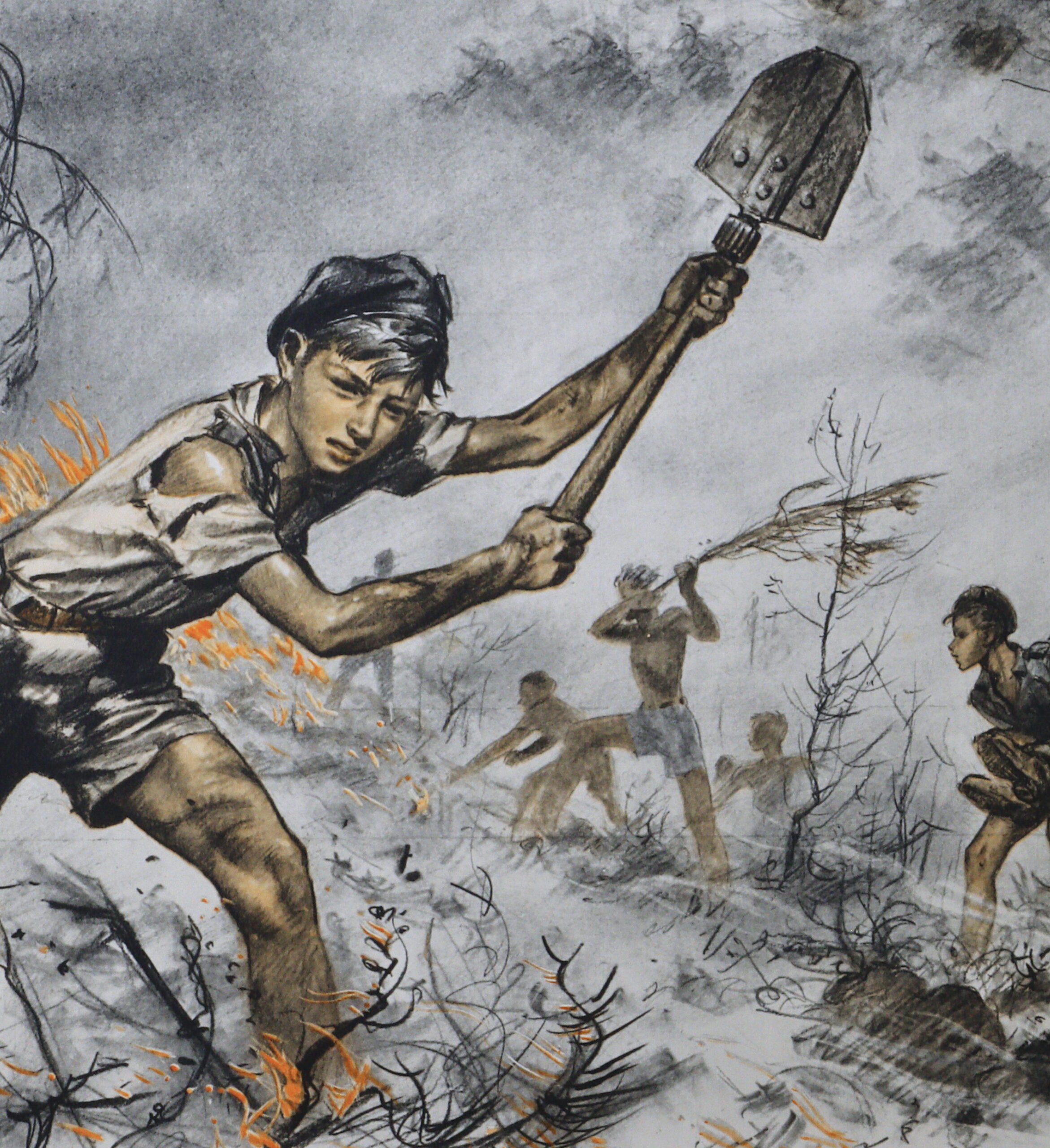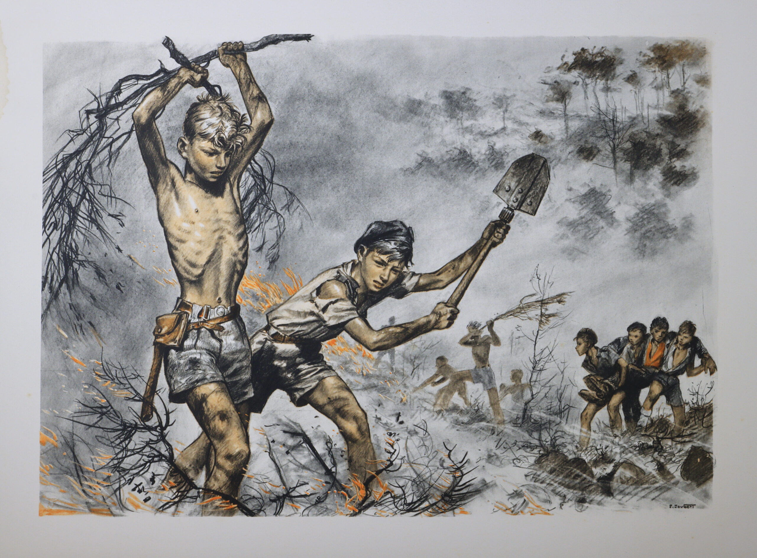 3 ème de la série de 1958 une série de 8 gravures en deux couleurs, noir et rouge, commandées par Jean-Louis FONCINE, en collaboration financière avec les Presses d’Ile de France, format 32×50. Là aussi la réalisation semble avoir été étalée dans le temps puisque son carnet de bord relève « incendie de forêt » dès 1956