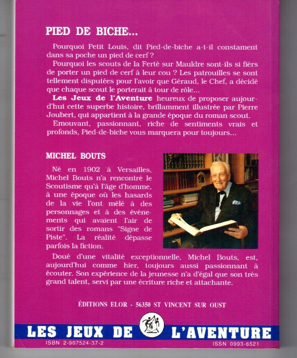 Roman scout : « Pied de Biche », par Michel Bouts, dessins de Pierre Joubert (l’illustrateur du scoutisme et des Signe de Piste), Editions Elor, collection Les Jeux de l’Aventure n° 20.