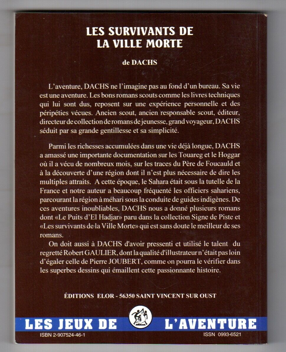 Roman scout : « Les Survivants de la ville morte », par Dachs, Couverture de Pierre Joubert (l’illustrateur du scoutisme et des Signe de Piste), dessins intérieurs de Robert Gaulier Editions Elor, 2è trimestre 1994, collection Les Jeux de l’Aventure n° 24.