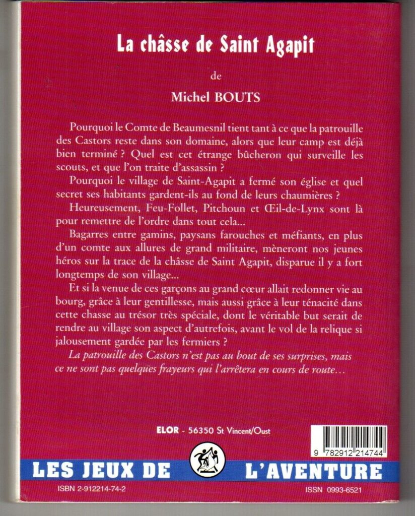 « La Châsse de Saint Agapit ». Editions de l’Orme Rond (ELOR) collection Jeux de l’Aventure (JDA) n° 57, 4è trimestre 2001, par Jacques MICHEL, roman scout, dessins de Pierre Joubert, l’illustrateur du scoutisme et des Signe de Piste.