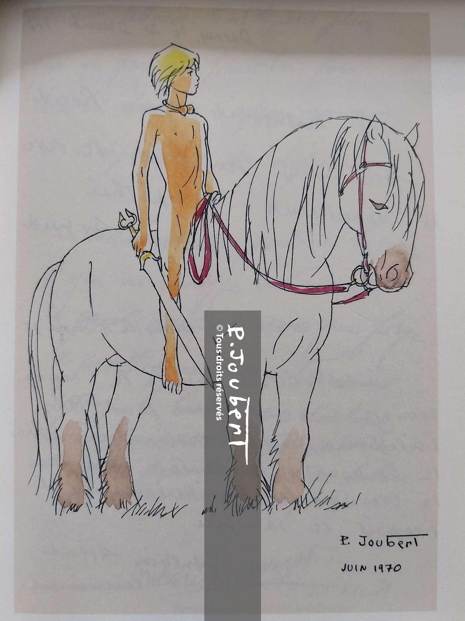 Dessin de commande. Il est accompagné dans le livre d’un courrier de PJ. “Quand on me demande un dessin si l’on a pas indiqué le sujet, je pense à la personne, ferme les yeux et m’arrête sur la première idée qui me passe par la tête. Pour vous, j’ai pensé à ce jeune Celte sur un énorme cheval […].”