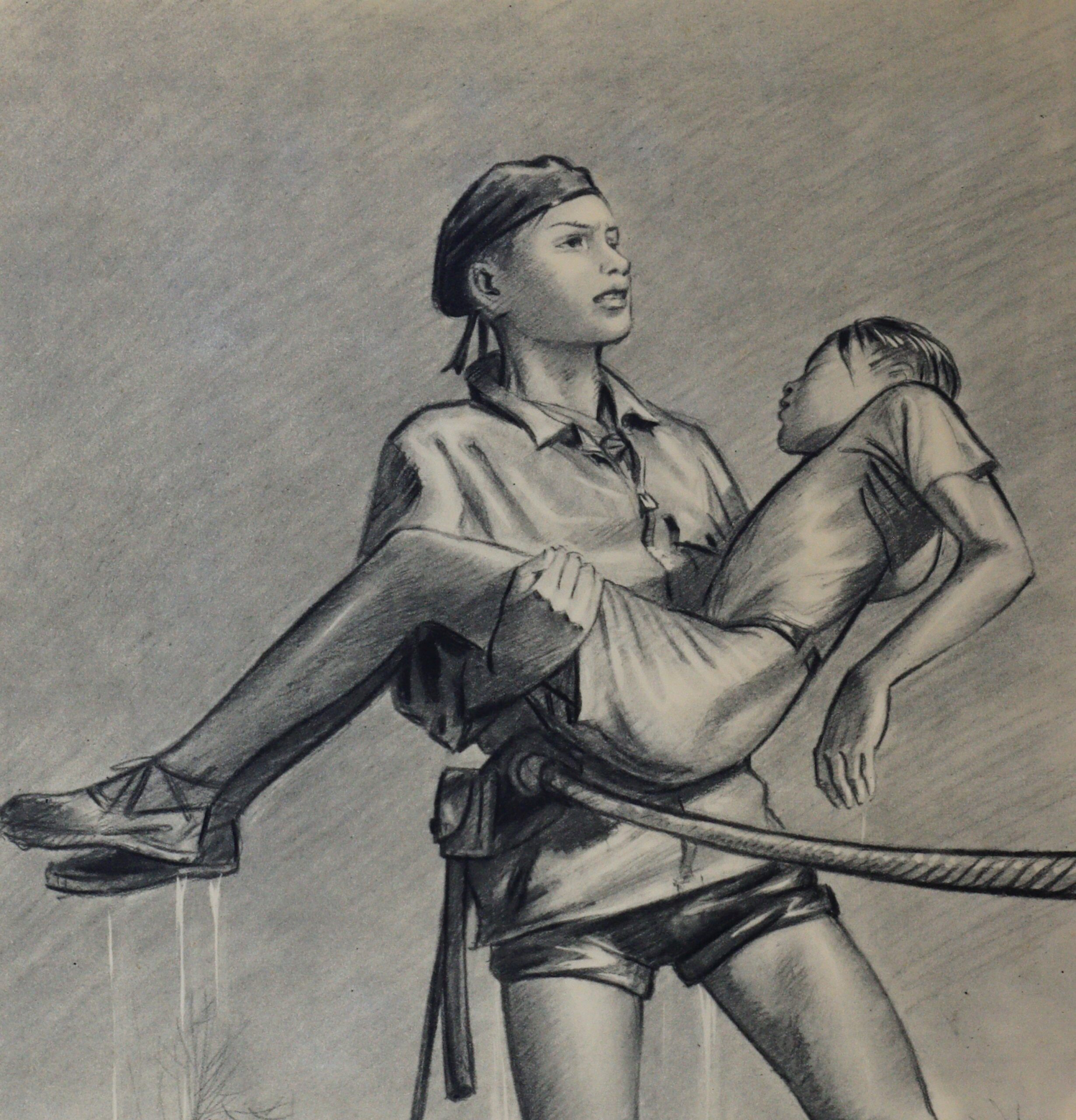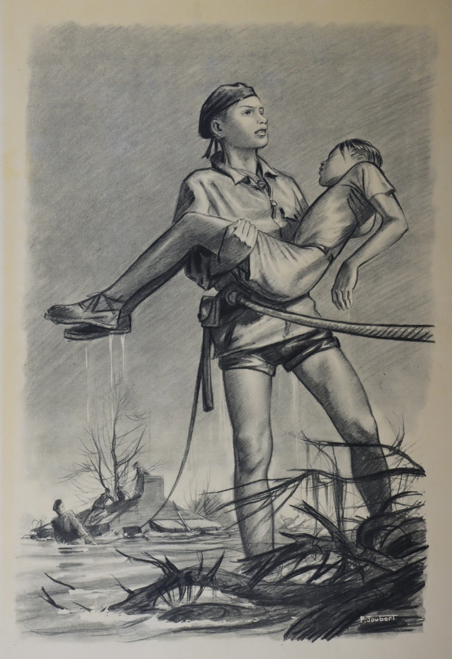 12 ème de la série de 1952 « Estampes de la vie scoute » une série de 13 gravures commandées par Jean-Louis FONCINE (« sujets scouts ou sociétés d’adolescents ») en noir et blanc, format 32×50 . Certaines ont été réimprimées (par Elor, les Amis du Signe de Piste, etc).