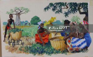 Code PJ : PierreJoubert-OR-RJ-JAM-KA-P7MH-1967 Titre : Les arachides remplissent les corbeilles Technique : Gouache (GOU) Description : Tiré de la revue “Jeunes années magazine” numéro spécial sur la vie quotidienne de deux enfants africains dans leur village du pays Baoulé, en Côte d’Ivoire. P7 milieu haut Date : 1967 Précision date : Non daté … Lire la suite de Les arachides remplissent les corbeilles – Original