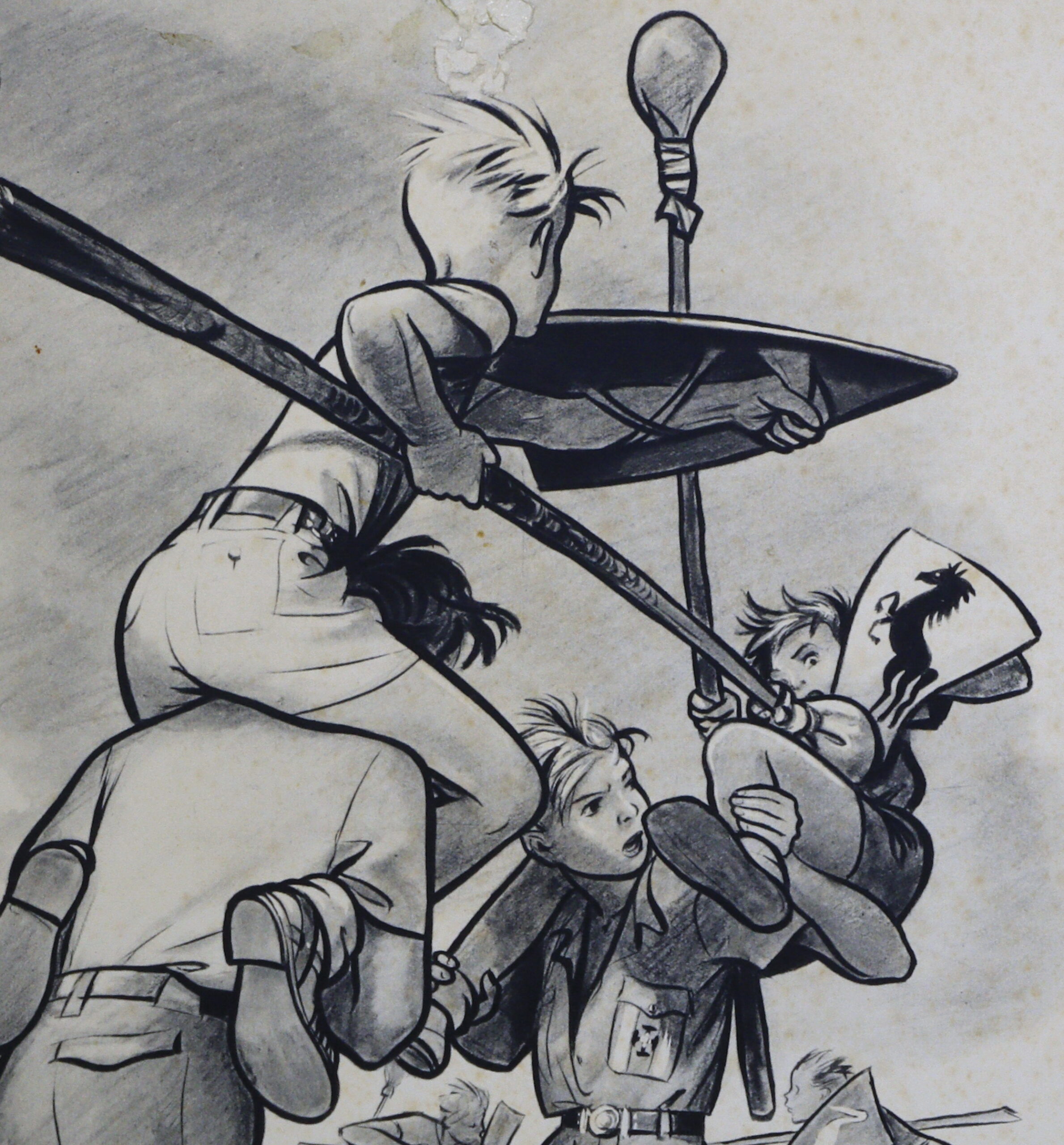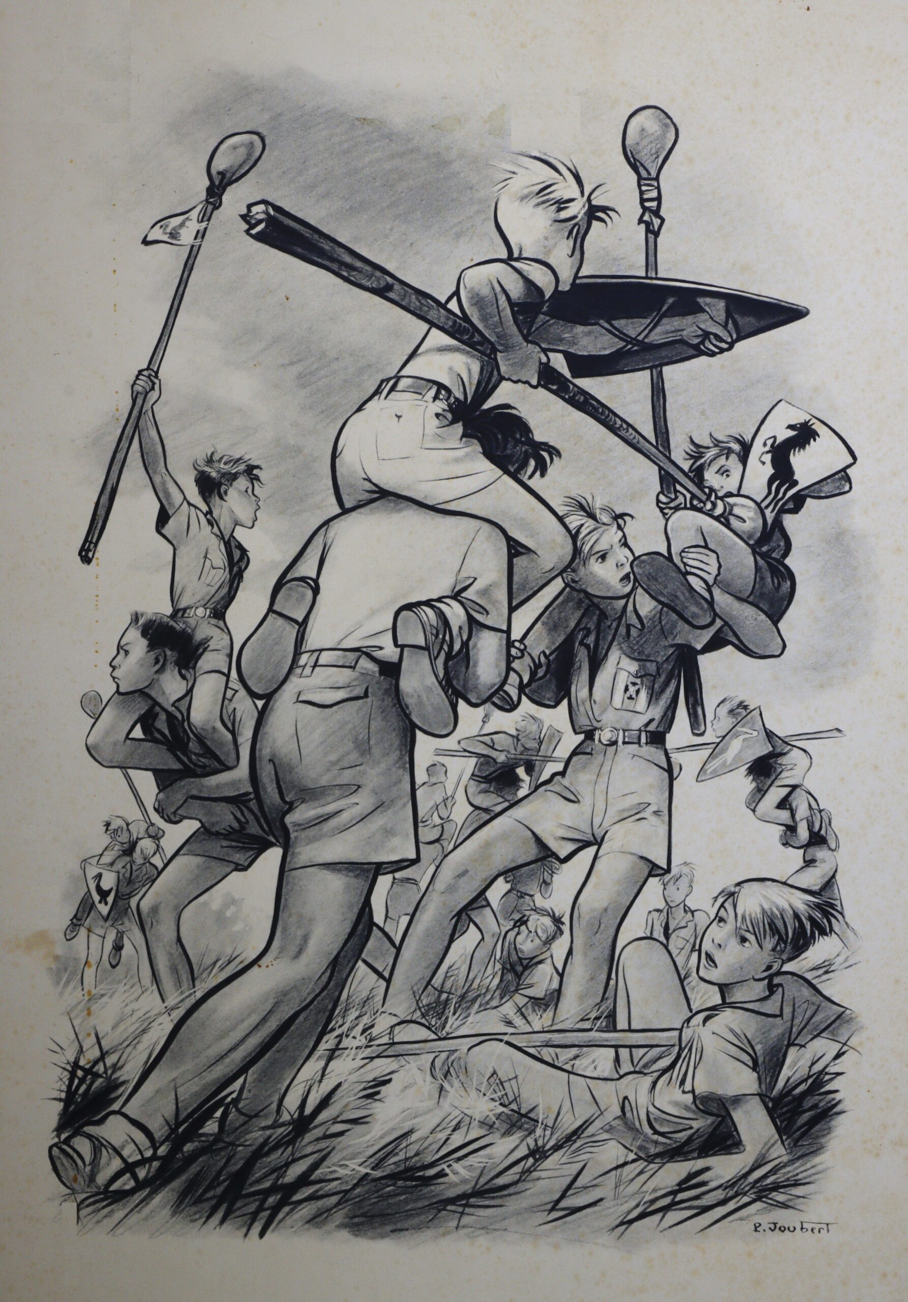 9 ème de la série de 1952 « Estampes de la vie scoute » une série de 13 gravures commandées par Jean-Louis FONCINE (« sujets scouts ou sociétés d’adolescents ») en noir et blanc, format 32×50 . Certaines ont été réimprimées (par Elor, les Amis du Signe de Piste, etc).