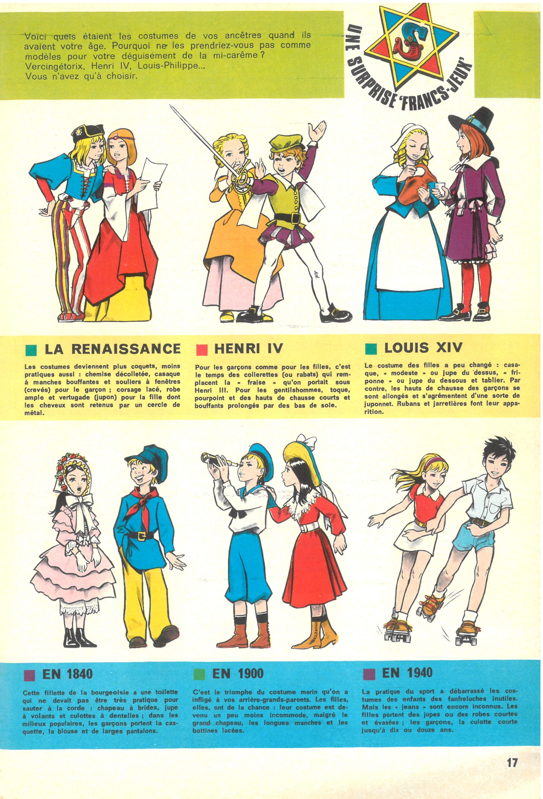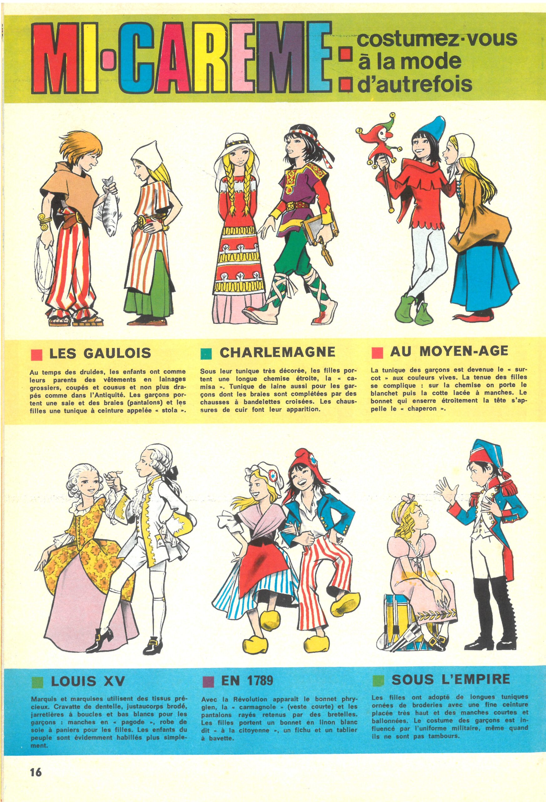 n° 640 (15/03/74) « Mi-carême, costumez-vous à la mode d’autrefois » 12 dessins sur 2 pages (9 d’entre eux sont repris page 160 de Souvenirs en vrac )