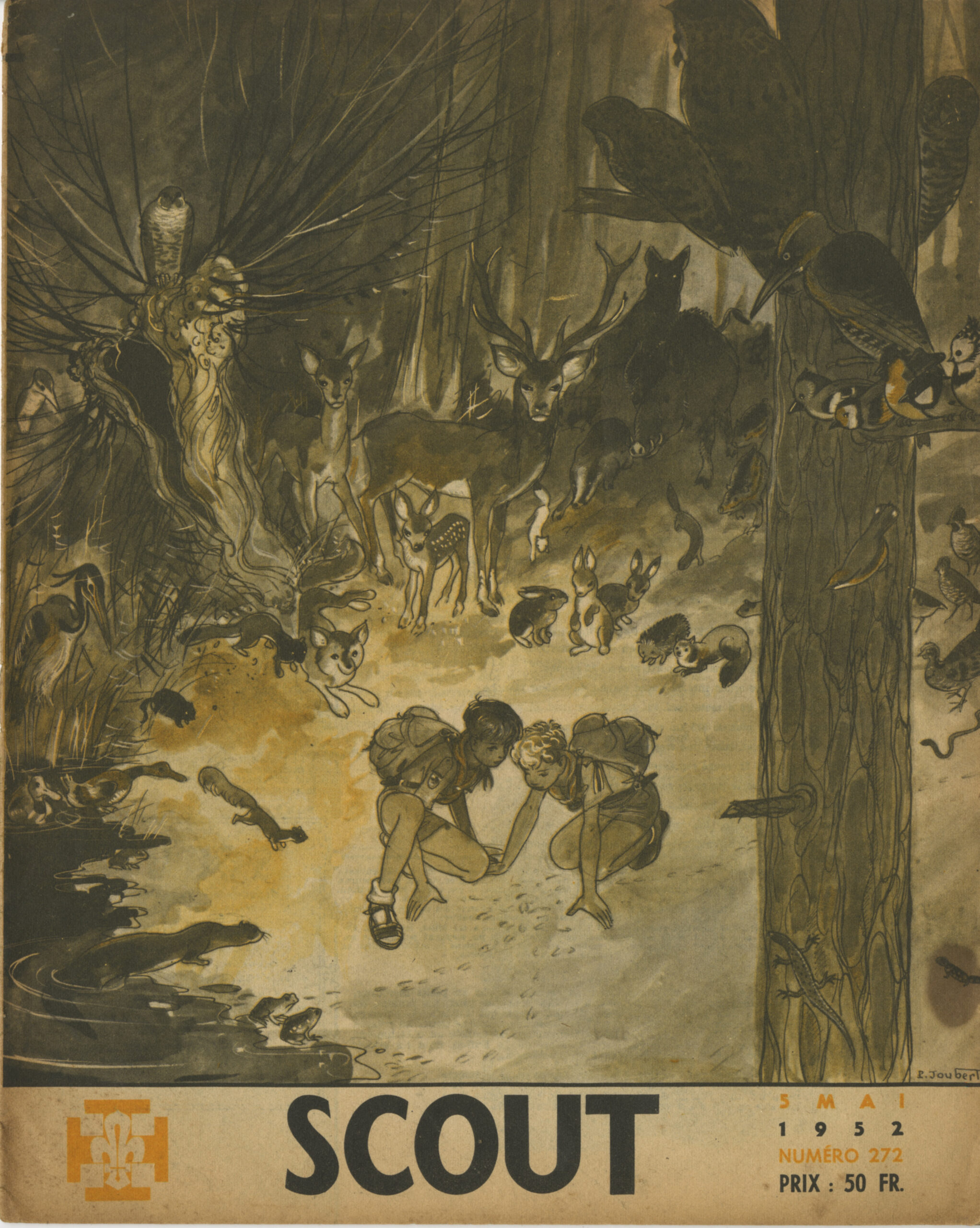 Scouts entourés d’animaux curieux dans la forêt : couv SCOUT 272 de 1952