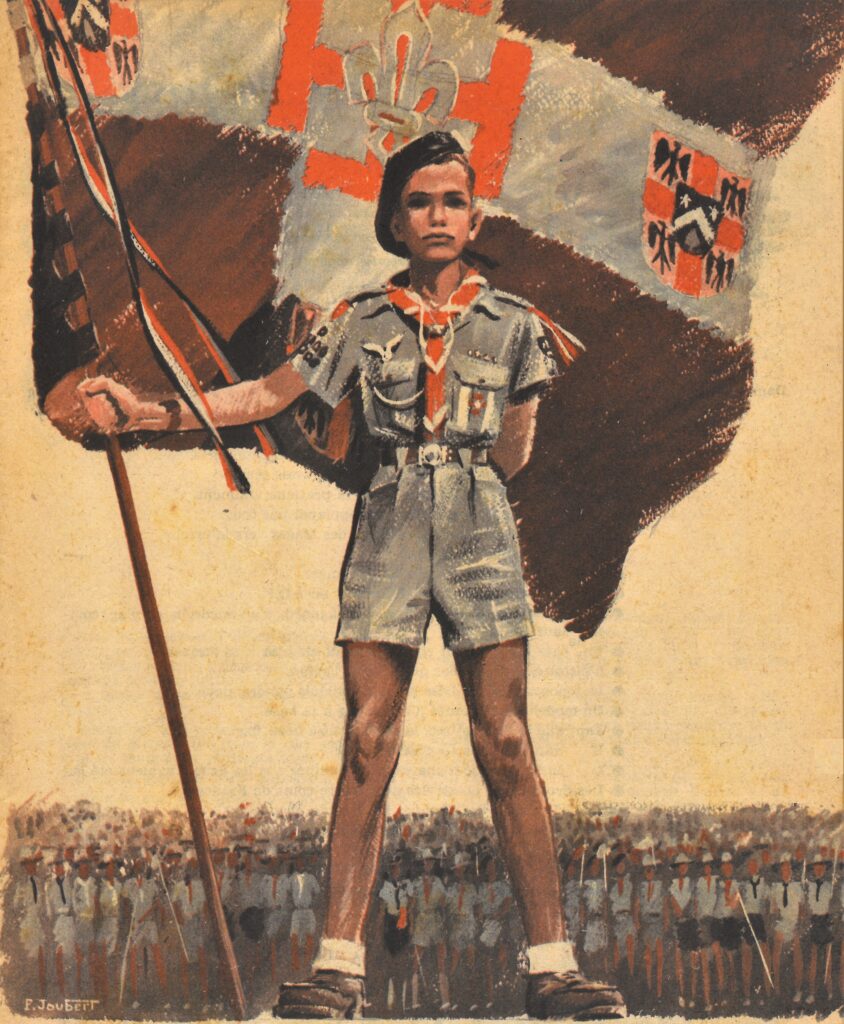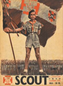 Scout au repos devant troupe avec étendard de région : couv SCOUT 278 de 1953