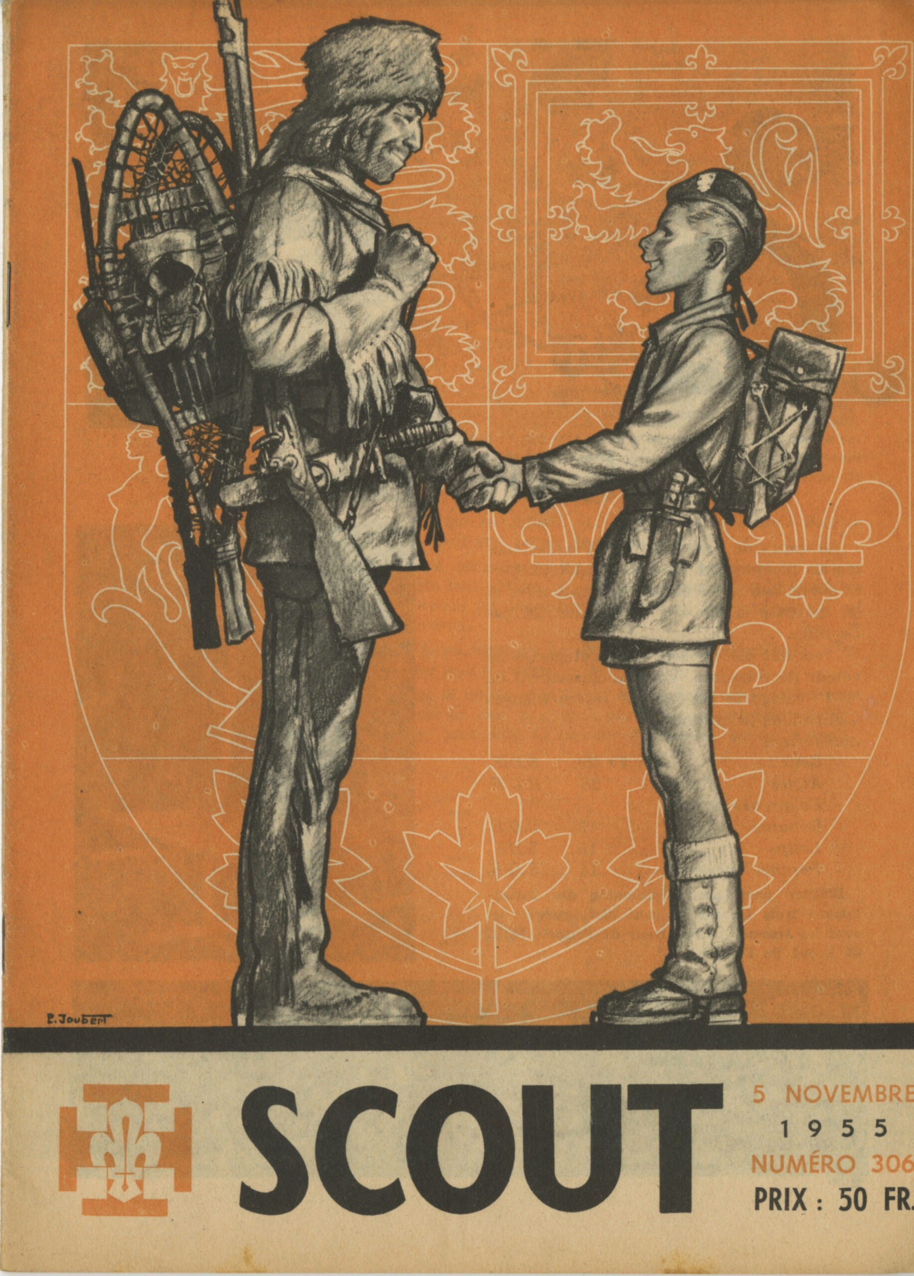 Trappeur serre la main gauche d’un raider : couv SCOUT 306 de 1955