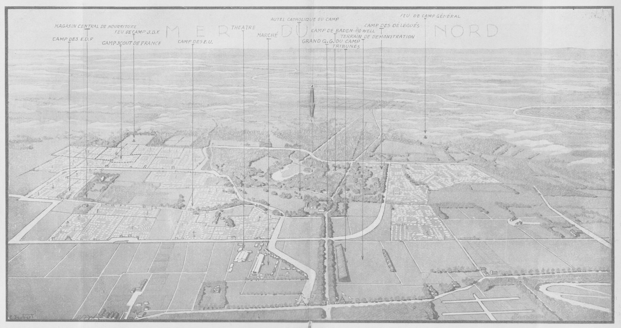 p.178-179 «Au pays des tulipes» (C.O.) croquis panoramique (s) du futur Jamboree de Vogelenzang