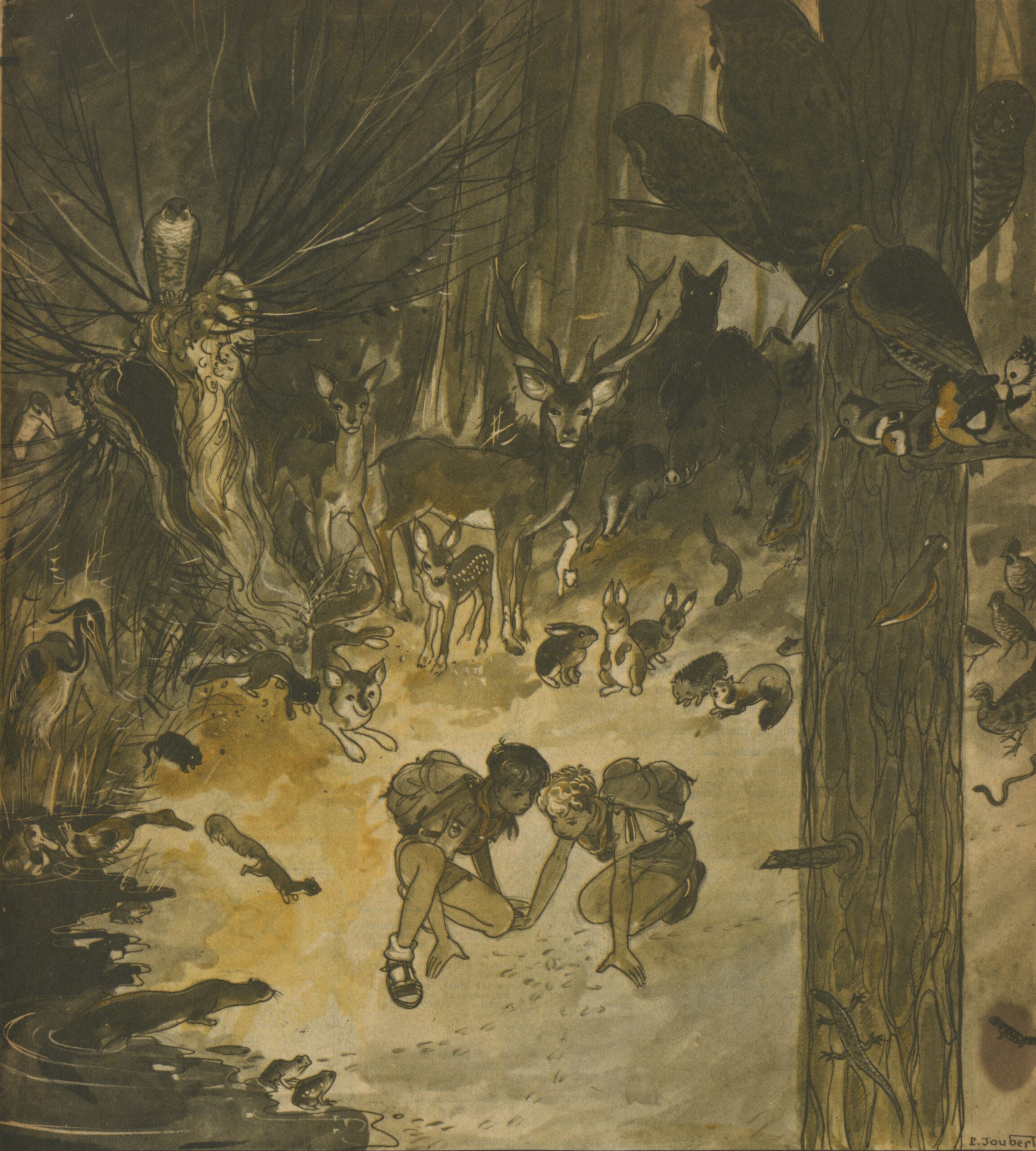couverture : scouts entourés d’animaux curieux dans la forêt(s)