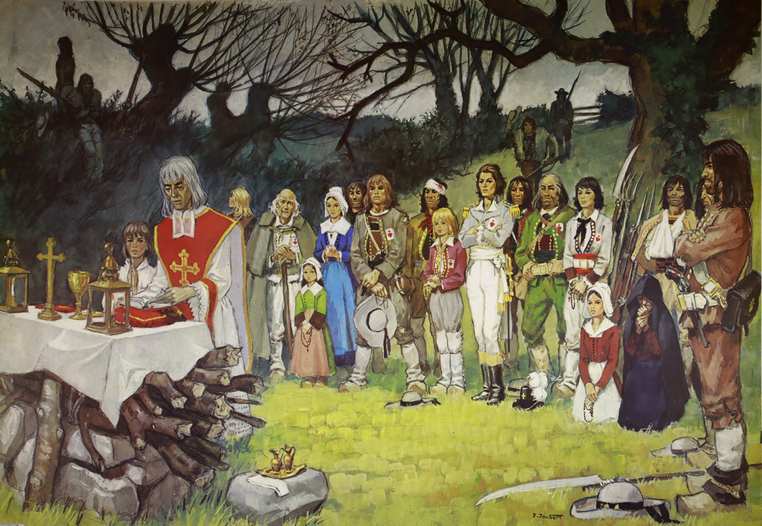 Titre : Tirage en Serie de Riaumont : Messe vendéenne dans les bois (poster 44×62),(la 2éd. a des bords jaunes) (gouache originale faite en 1970, d’après ses carnets) 8€