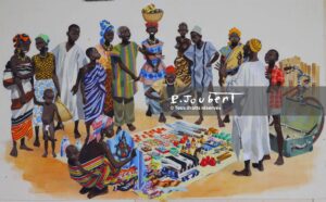 Code PJ : PierreJoubert-OR-RJ-JAM-KA-P21-1967 Titre : Voilà Fofana ! , ,le marchand ambulant , trainant sur une vieille bicyclette une énorme valise . Technique : Gouache (GOU) Description : Tiré de la revue “Jeunes années magazine” numéro spécial sur la vie quotidienne de deux enfants africains dans leur village du pays Baoulé, en Côte … Lire la suite de Voilà Fofana ! le marchand ambulant- Original